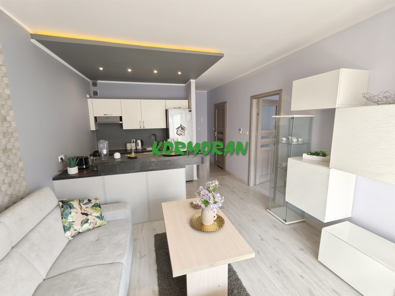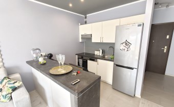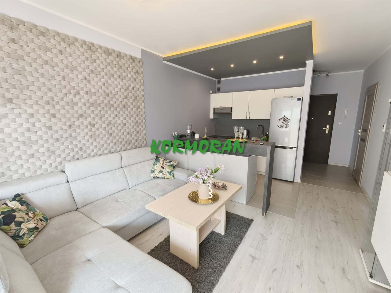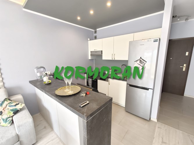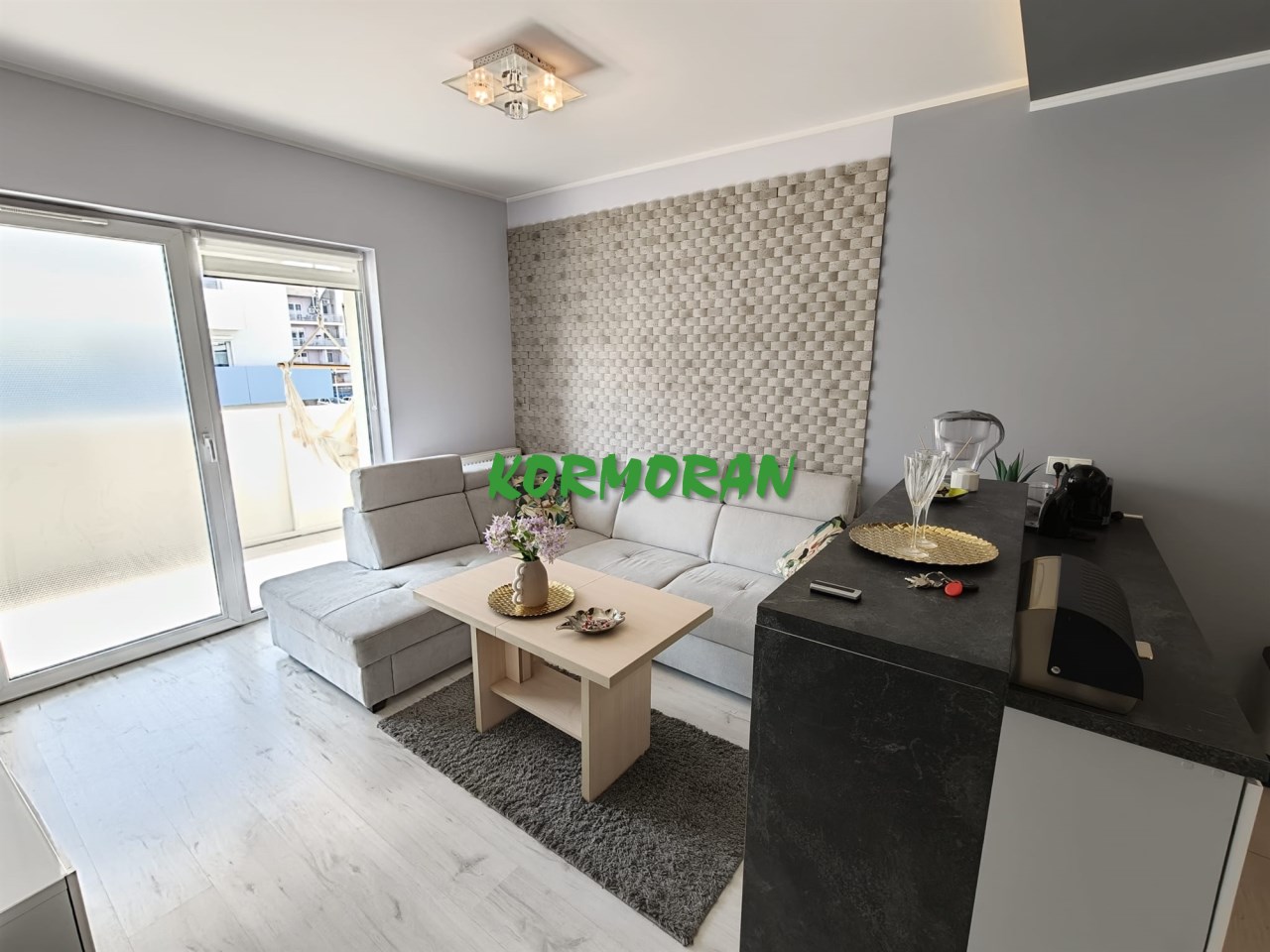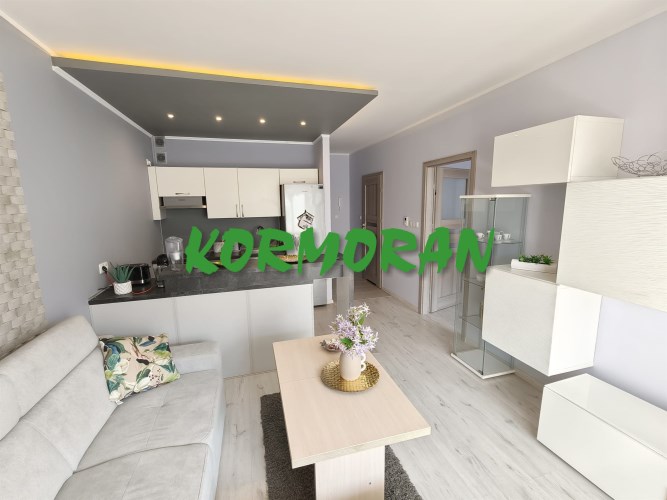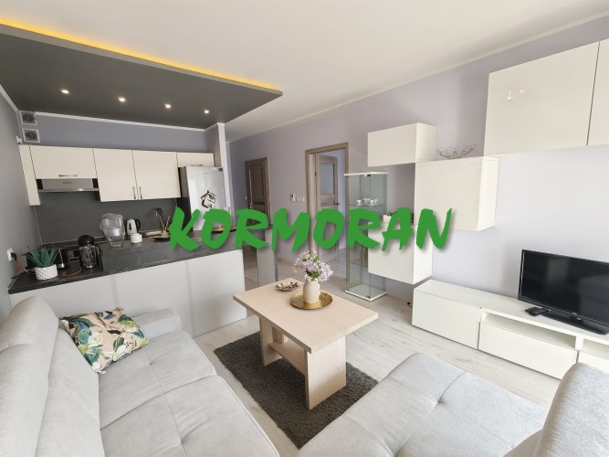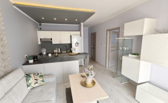 • Salon z aneksem kuchennym: Słoneczna strefa dzienna z wyjściem na balkon, przedpokój z zabudowaną szafą z drzwiami przesuwnymi