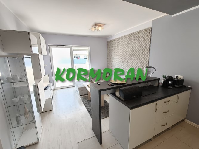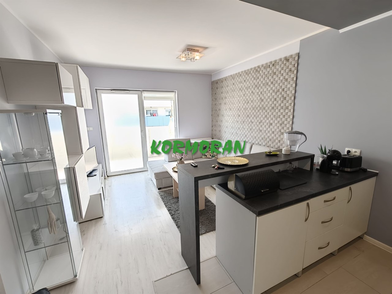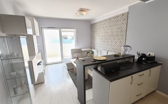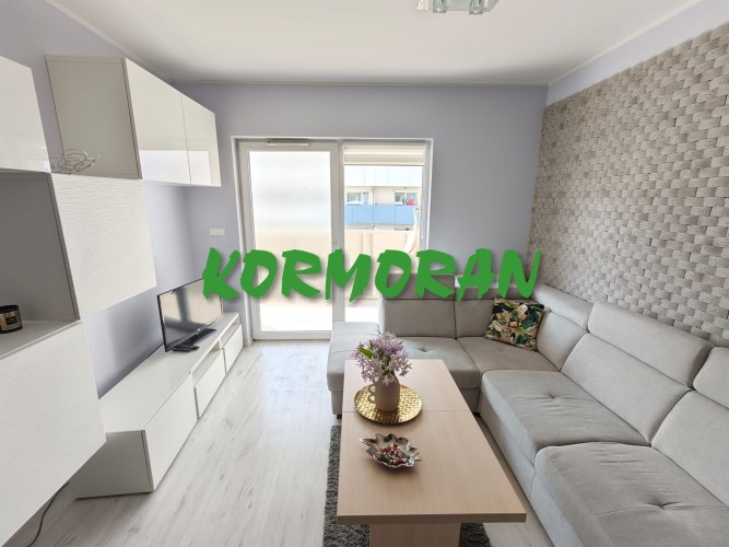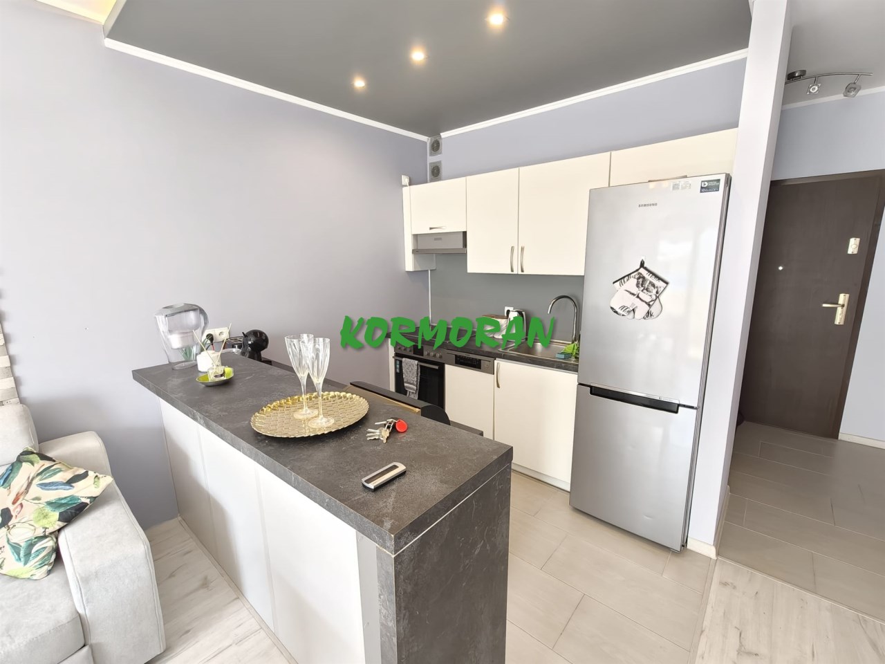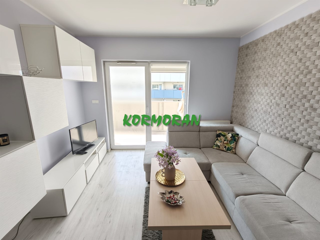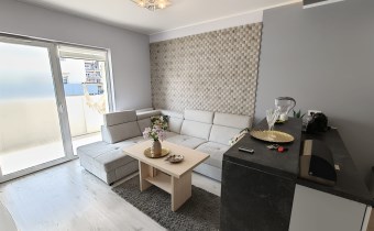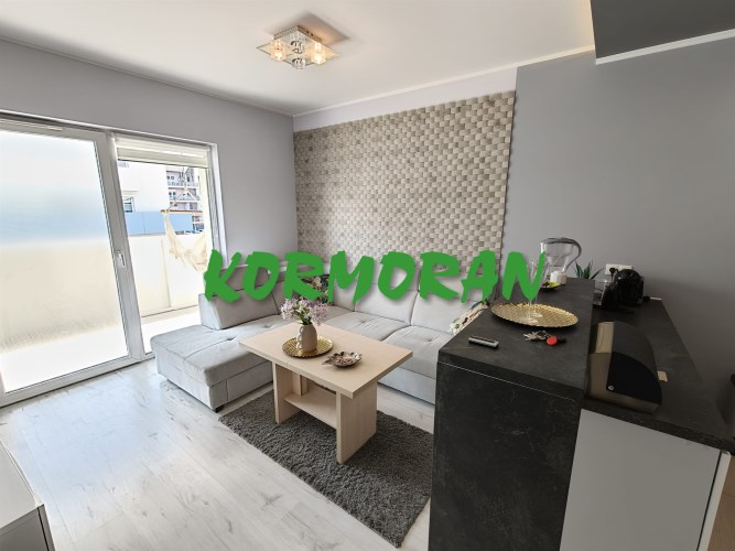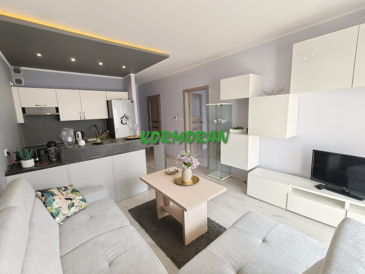 • Salon z aneksem kuchennym: Słoneczna strefa dzienna z wyjściem na balkon, przedpokój z zabudowaną szafą z drzwiami przesuwnymi
